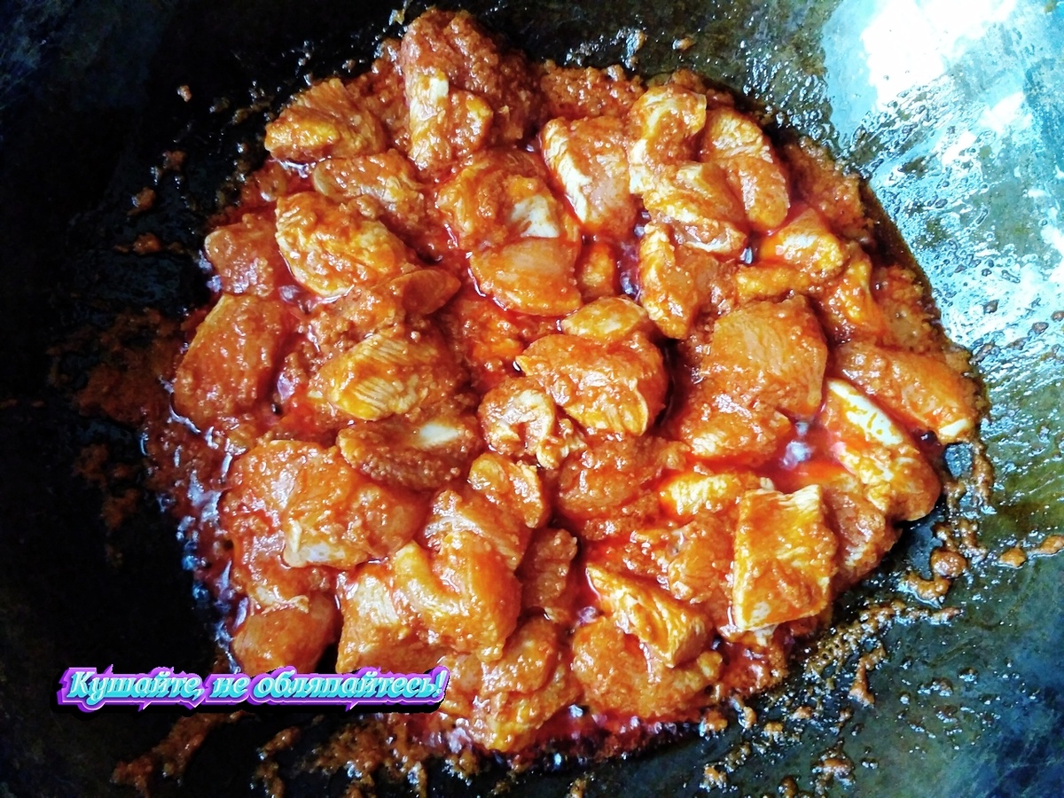 Продолжаем осваивать тайскую кухню. И развлекаться с красным карри. Сегодняшнее блюдо довольно простое, хотя и не без экзотических (хотя в наше время всё это достать не составляет труда) ингредиентов, и готовится за считанные минуты (не считая предварительной подготовки). Муэры заливаем кипятком и замачиваем в течение получаса. Курятину нарезаем на небольшие кусочки. В воке на среднем огне разогреваем растительное масло и обжариваем чесночную пасту до появления сильного аромата. Добавляем пасту карри, обжариваем в течение 30 секунд и заливаем воду. Перемешиваем до образования однородной массы и кладём курицу. Готовим, постоянно помешивая, в течение трёх минут, затем добавляем грибы и кокосовое молоко. Готовим ещё пять минут, кладём сахар, перемешиваем до его полного растворения, снимаем вок с огня. Украшаем кинзой и нарезанным чили. В качестве гарнира рекомендуется рис (но я обошёлся без него). Приятного аппетита!