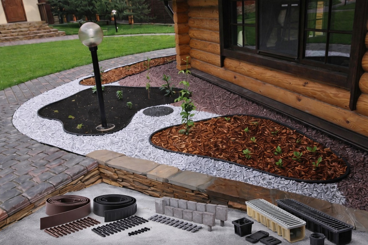 Каждая зона на участке работает в своем режиме. Пешеходные дорожки испытывают регулярную динамическую нагрузку, площадки — точечную и распределенную, газон — сезонное переувлажнение и вытаптывание, а на клумбах постоянно меняется структура грунта из-за полива и роста растений. Если эти зоны не разделены конструктивно, начинается их взаимное влияние: сыпучие материалы перемещаются, грунт размывается, покрытия теряют опору по краям.