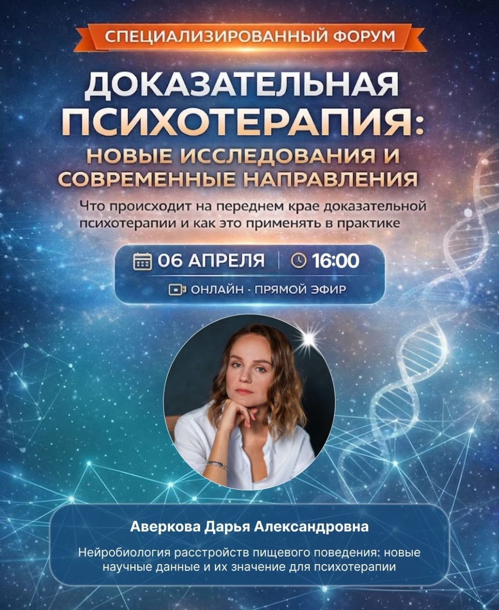 🙎♀️ ️Дарья Александровна Аверкова медицинский психолог, специалист по расстройствам пищевого поведения, сертифицированный специалист по интуитивному питанию, преподаватель CBT Clinic Education Тема доклада: 🍩 Нейробиология расстройств пищевого поведения: новые научные данные и их значение для психотерапии По итогам доклада: - Вы начнёте видеть как симптом формируется и поддерживается исходя из ведущей системы регуляции; - У Вас появится новый угол зрения, почему клиент делает то, что он делает и почему ему бывает так сложно это изменить; - Вам будет проще подбирать вмешательства, которые действительно меняют поведение, не усиливая фрустрацию избыточно; - Вы сможете гибче сочетать подходы опираясь на состояние той, или иной системы клиента в данный момент 📝 Это выступление поможет обновить профессиональную оптику специалиста в работе с клиентам с РПП и посмотреть на основные симптомы с точки зрения биологии. Ждем Вас на встрече! 📅 6 апреля 🕚 начало конференции в 11:00 Выступ