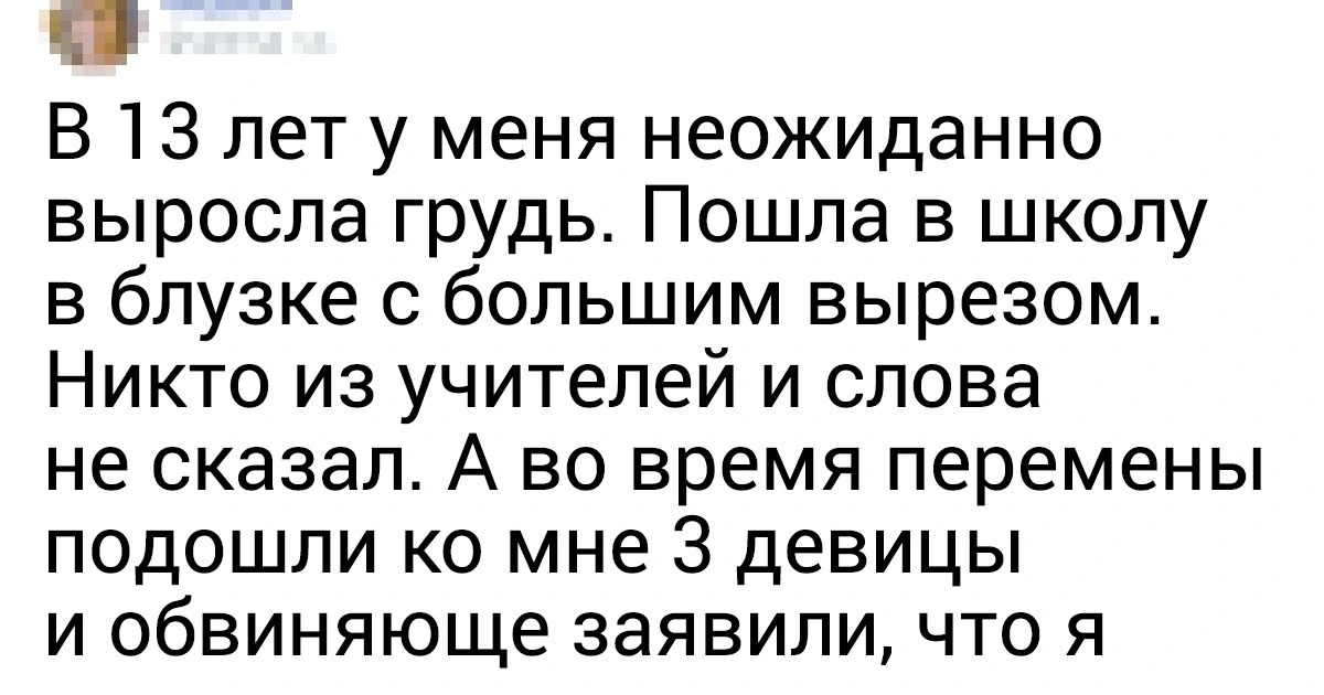 В 13 лет у меня неожиданно выросла грудь (это у нас семейное). Пошла в школу в блузке с большим вырезом. Никто из учителей ни слова не сказал. А во время перемены подошли ко мне 3 девицы и обвиняюще заявили, что я набила лифчик ватой. Я очень удивилась. До сих пор стараюсь носить такую одежду, которая не подчеркивает грудь, потому что нервничаю, когда на меня смотрят.