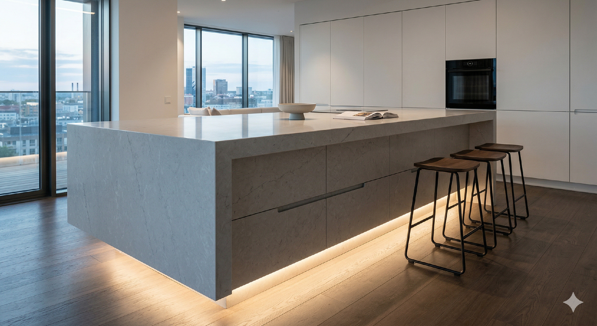 Представьте: массивная каменная плита весом в сто килограммов буквально замерла в воздухе. Под ней нет ни ножек, ни тумб, ни привычных опор — только пустота и мягкий свет. Это не фокус и не сбой в матрице, а парящая столешница — один из самых эффектных приемов в современном дизайне. Разбираемся, как устроена эта инженерная иллюзия, почему она не падает и какой материал лучше выбрать для «левитации». Как это работает: физика против гравитации Секрет «свободного полета» скрыт от глаз наблюдателя. Чтобы тяжелый камень не рухнул, инженеры используют несколько хитростей: Важно: Парящая конструкция — это не хрупкий декор. Грамотно смонтированная консоль спокойно выдерживает вес тяжелой посуды и даже если на неё облокотится взрослый человек. Световая режиссура: зачем столешнице подсветка? Без правильно выстроенного света эффект парения будет неполным. Светодиодная лента, спрятанная в специальную нишу, окончательно «отрывает» камень от пола. Из чего делать «летающую» мебель? Далеко не каждый м