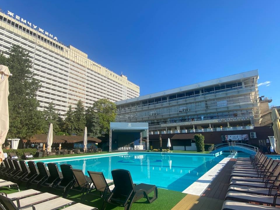 Это огромное 17-этажное здание почти на 900 номеров на самом берегу моря, в центральном Сочи. Тут всё рядом - дендрарий, Зимний театр, Морпорт и центральная набережная. У гостиницы большая зеленая территория с прекрасно развитой инфраструктурой. В главном здании находится Культурно-выставочный центр с несколькими большими конференц-залами, благодаря чему Жемчужина выступала как основной партнер фестивалей Кинотавр и КиВиН.