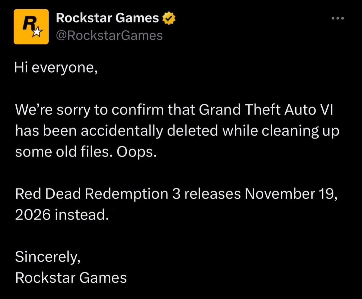 , We're sorry to confirm that Grand Theft Auto VI has been accidentally deleted while cleaning up some old files. Oops. Red Dead Redemption 3 releases November 19,2026 instead. Sincerely, Rockstar Games #игры@inyoueyes