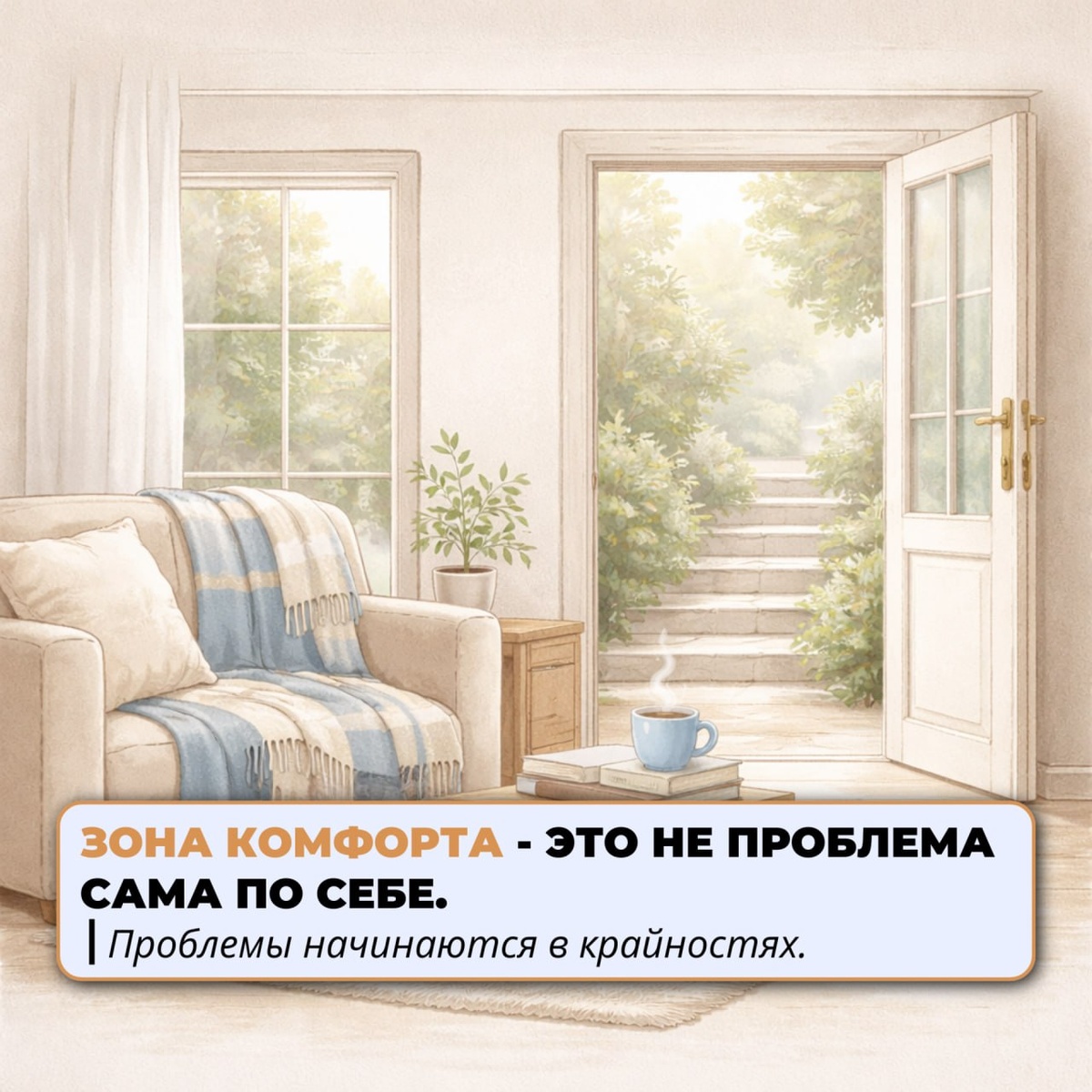 ? Про зону комфорта обычно говорят очень прямолинейно: ➡️если хочешь расти - выходи; ➡️если сидишь в зоне комфорта - стоишь на месте. ➡️если тебе спокойно - значит, ты избегаешь развития. Но в реальности все намного тоньше. Зона комфорта - это не «диван и лень». Это психологически знакомое пространство, в котором человеку более-менее понятно, что происходит, чего ожидать и как с этим справляться. В этом пространстве меньше тревоги, меньше неопределенности, меньше внутреннего напряжения. И сама по себе зона комфорта - не враг. Она нужна психике как опора. Проблемы начинаются в двух крайностях. Первая крайность - застревание. Когда человек слишком долго остается только в знакомом, избегает перемен, не идет туда, где есть развитие, смысл, новый опыт, движение. Тогда жизнь может становиться безопасной, но слишком узкой. Появляется ощущение, что все предсказуемо, но как будто мало живого интереса, энергии и роста. Вторая крайность - не менее опасная. Когда человек живет в режиме пост