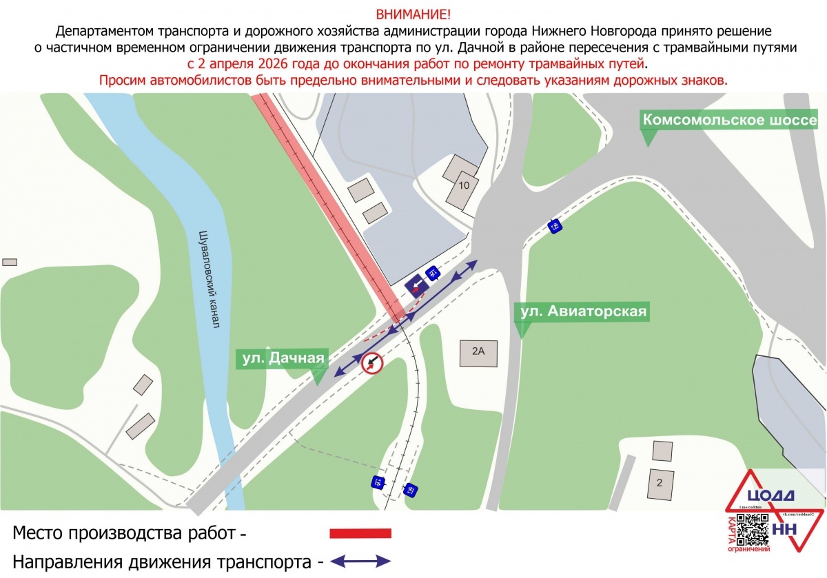 Улицу Дачную частично перекрывают в Нижнем Новгороде. Об этом сообщает пресс-служба горадминистрации. Ограничения начнут действовать со 2 апреля. Они связаны с проведением работ по сооружению монолитных участков трамвайных путей. Преимущество на данном участке будет у тех, кто едет со стороны Комсомольского шоссе. В полном объеме движение возобновят после завершения ремонта. Точных сроков нет. Ранее мы сообщали еще о трех улицах, которые будут перекрыты в Нижнем Новгороде в апреле. Самые интересные и срочные новости читайте у нас в Telegram и MAX