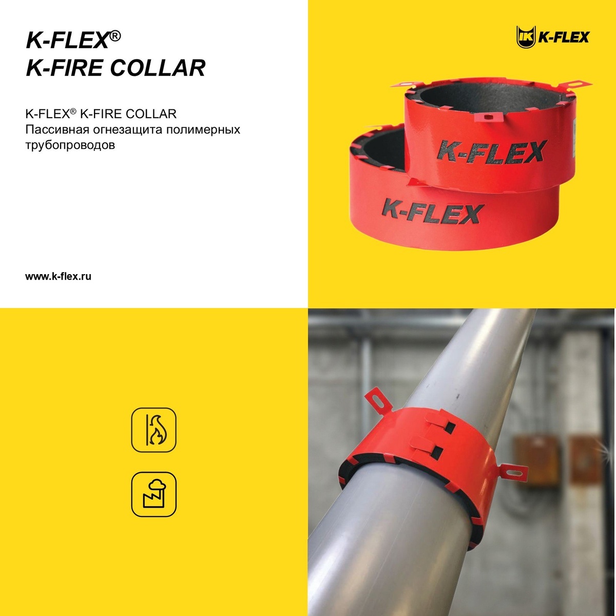 При пожаре полимерные трубопроводы быстро плавятся, оставляя сквозные дыры в стенах и перекрытиях. Это прямой путь для распространения пламени и угарного газа по всему зданию. Проектируете или монтируете инженерные сети? Защита этих узлов — ваша прямая ответственность. Решение: противопожарная муфта K-FLEX K-FIRE COLLAR. Она работает как надежный стопор. При критическом нагревании специальный вкладыш внутри муфты мгновенно вспучивается и наглухо перекрывает отверстие, блокируя пожар. Почему именно K-FIRE COLLAR: Прочность: Металлический корпус из оцинкованной стали (0,55 мм) с эластичным антикоррозийным покрытием. Скорость монтажа: Лепестковый замок и крепежные проушины позволяют установить муфту за пару минут. Универсальность: Идеально подходит для жилых домов, больниц, ТЦ и промышленных предприятий. Ваша польза: Вы сдаете объект пожарному надзору с первого раза, без штрафов и переделок, а главное — обеспечиваете реальную безопасность людей.
