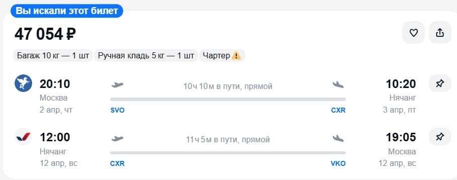 ! Билеты из Москвы в Нячанг (2–12 апреля) отдают за 47 000 ₽ вместе с багажом 10 кг. 🏨 Отели от 690 рублей в сутки на двоих (3100 рублей на человека за 9 ночей при бронировании вдвоем) https://trip.tpo.li/D5Py8AqL В Нячанге самый сезон! Успейте занять свое место под пальмой!