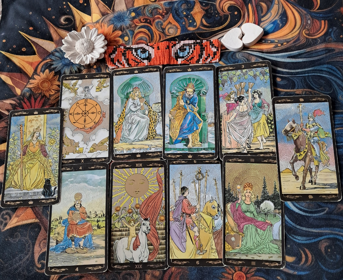 Колесо Фортуны + Королева Кубков + Король Кубков + 3 Кубков + Солнце + 6 Жезлов + Императрица + 4 Пентаклей.