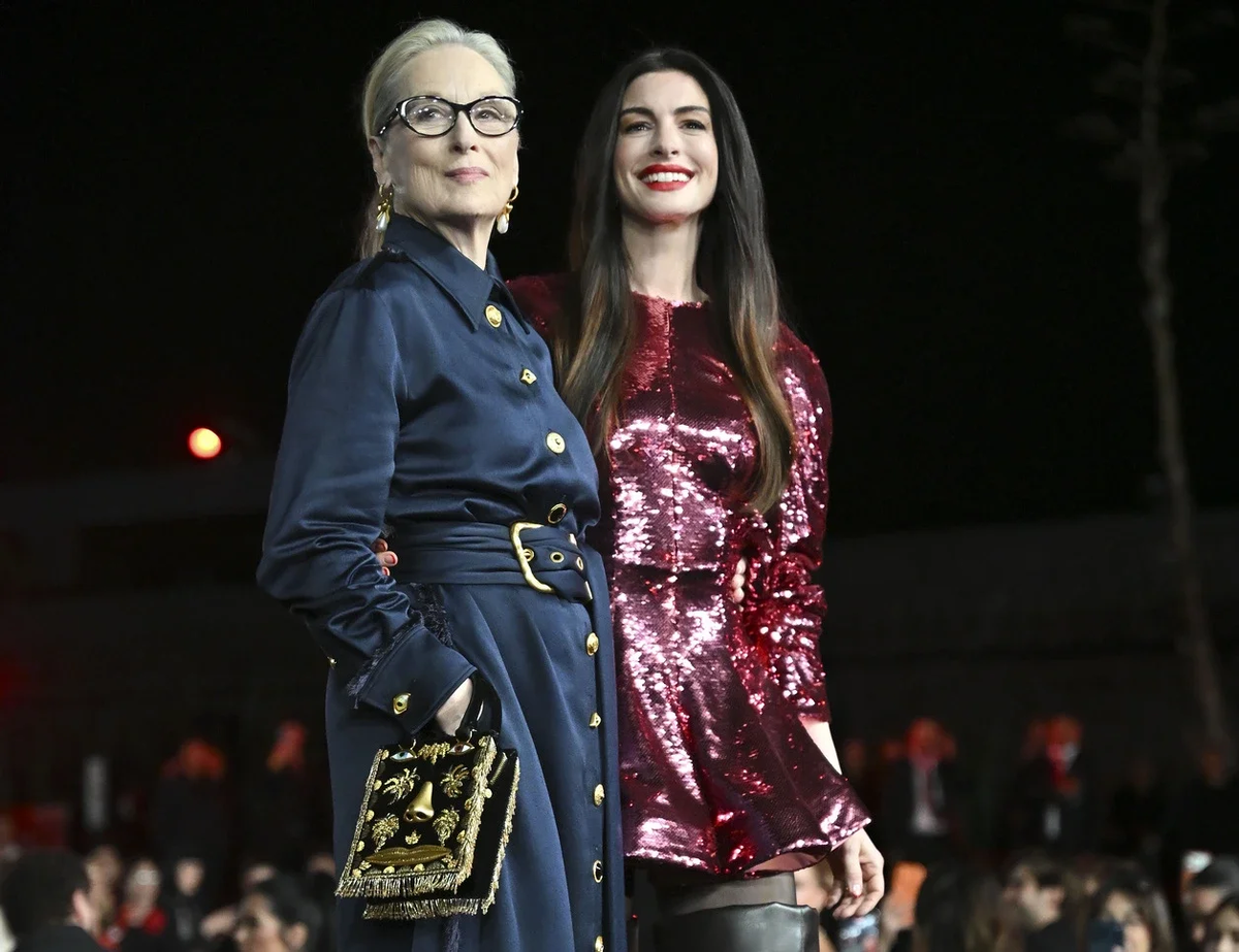 Конечно, всё внимание было приковано к образам актрис, и они не подвели ожидания. Хэтэуэй появилась в сверкающем бордовом мини, дополнив его высокими сапогами шоколадного оттенка. Стрип выбрала более сдержанный, но не менее эффектный вариант — шёлковое платье-рубашку тёмно-синего цвета с акцентным поясом и массивными украшениями. Поклонники уже отметили: за почти 20 лет с момента выхода первой части фильма актрисы будто не изменились — разве что стали ещё увереннее в своём стиле.