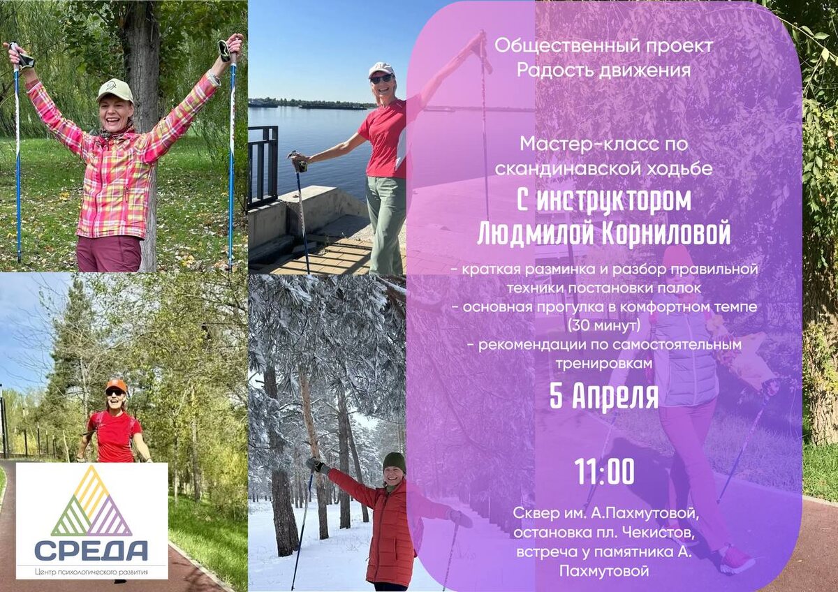 ! Я участвую в Общественном проекте «Радость Движения» от Центра психологического развития «Среда» Начнем утро в Радости Движения! Скандинавская ходьба — для любого возраста и уровня подготовки! 5 апреля в 11.00 приглашаем всех на часовую тренировку по скандинавской ходьбе на свежем воздухе с инструктором Людмилой Корниловой. Скандинавская ходьба — прекрасный способ поддержания здоровья, улучшение осанки, самочувствия и настроения, мягкая нагрузка на суставы. Занятие включает: - краткую разминку и разбор правильной техники постановки палок - основную прогулку в комфортном темпе (30 минут) - растяжка после ходьбы - рекомендации по самостоятельным тренировкам С собой: удобная одежда, кроссовки, палки (можно взять напрокат, в наличии 5 палок), вода. 📆Когда: 5 апреля в 11:00 ✅ Где: Сквер им. А.Пахмутовой, остановка пл. Чекистов, встреча у памятника А. Пахмутовой Приходите сами и с друзьями! ВХОД СВОБОДНЫЙ!