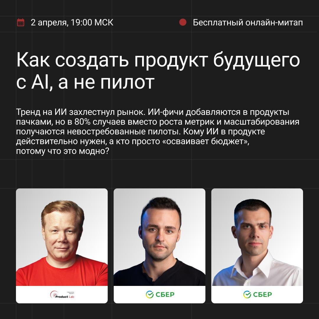 ? Тренд на AI захлестнул рынок. AI-фичи добавляются в продукты пачками, но в 80% случаев вместо роста метрик и масштабирования получаются невостребованные пилоты. Кому AI в продукте действительно нужен, а кто просто «осваивает бюджет», потому что это модно? Обсудим на прямом эфире завтра, 2 апреля в 19:00 по Москве. У нас неделя прямых эфиров, да :) 📌 Поговорим о мифах, провалах бигтеха и рецепте масштабирования на реальных кейсах на онлайн-митапе, который является тизером к большой очной конференции Product Focus Club. Эксперты эфира: • Андрей Бадин, основатель и СЕО Product Lab, автор телеграм-канала «Управляй иначе» • Леонид Шашков, CPO в Сбер (опыт: 1C, DHL, Я. Маркет, Ренессанс Страхование) • Илья Головко, CPO в Сбер (опыт: BCG, CУЭК, УГМК, Билайн, Sanofi, Glencore) Ребята ведут телеграм-канал про искусственный интеллект для продактов и проджектов. Эфир будет полезен предпринимателям, руководителям, продакт-менеджерам разных уровней и всем, кто хочет создавать и развивать