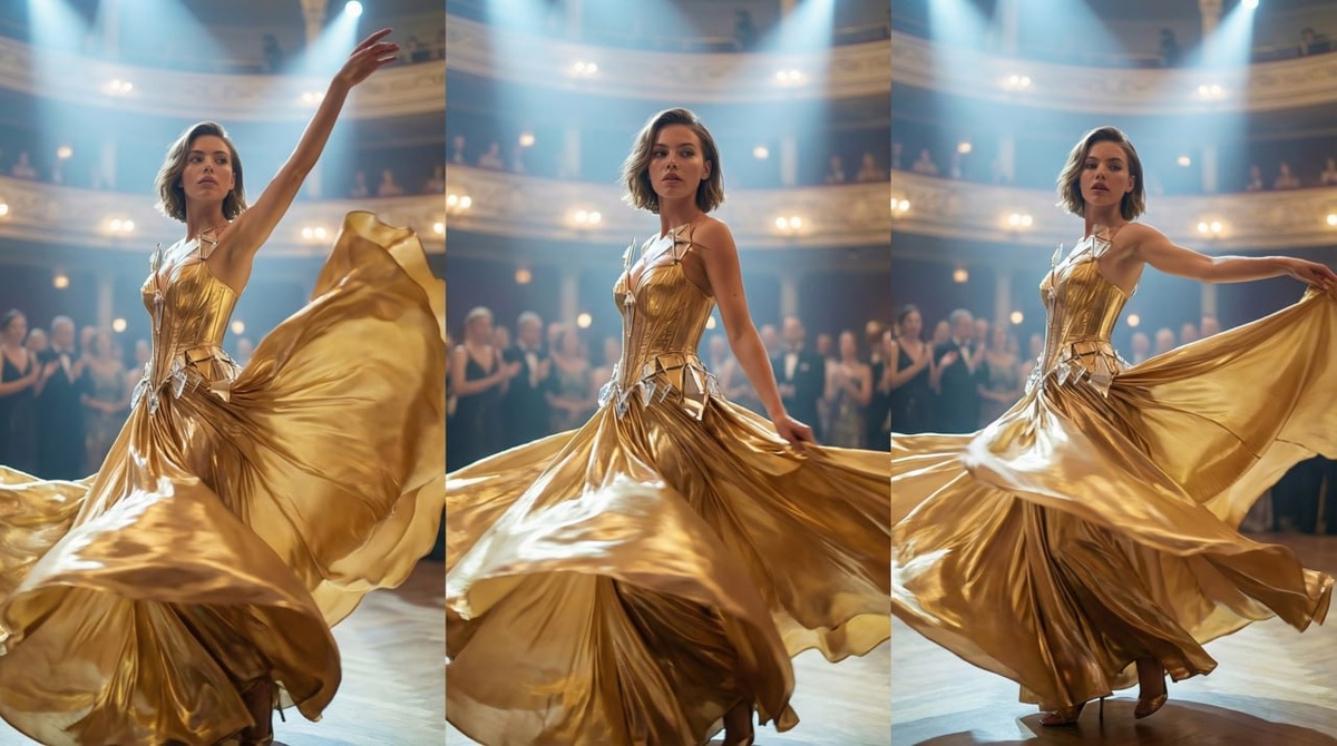 🧠 Prompt: SAVE FACIAL FEATURES FROM THE REFERENCE PHOTO: A captivating choreographic scene unfolds in the opera house's vast, contemporary ballroom, designed in Art Deco and Futurist styles, where sparkling crystals and massive brass chandeliers form intricate geometric patterns on the ceiling. The space is bathed in a combination of powerful, cool lighting and soft, golden reflections from spotlights; the floor and walls are lined with polished marble, inlaid with delicate gold lines and enormous stylized crystal panels. The focus is on the young woman from the uploaded photograph, dynamically twirling in the midst of a high-speed pirouette during a modern ballet performance. The pose is captured from slightly below: her body is tense, her arm reaching up and back, creating a lightning-fast, expressive gesture. Her face expresses modern confidence, her gaze is directed into the distance, and her hair is styled short and stylishly. She wears a striking avant-garde outfit, seemingly wo