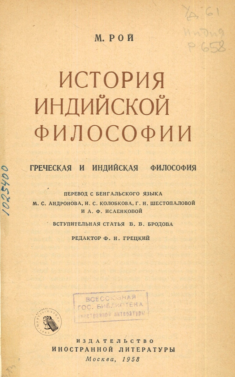 🇮🇳📖 Рой, Моноронджон История индийской философии : Греческая и индийская философия / М. Рой; Пер. с бенг. яз. М. С. Андронова [и др.]; Вступ. ст. В. В. Бродова; Ред. Ф. Н. Грецкий. - Москва : Издательство иностранной литературы, 1958. - 548 с. - Парал. тит. л. на бенг. яз. 📖 Читать книгу • Философия • Материализм • Древняя Греция • Философия • Индия • 🕉 #bookzealots