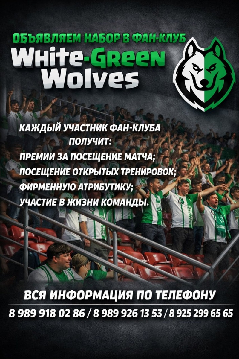 ! Фан-клуб White-Green Wolves рад сообщить о старте уникальной программы поддержки верных болельщиков футбольной команды «Ахмат»! ✅ Каждый участник фан-клуба теперь сможет: ⚪️ получать премии за посещения матча; 🟢 посещать открытые тренировки; ⚪️ обрести эксклюзивную фирменную атрибутику клуба; 🟢 полностью участвовать в жизни команды. Вступай к нам, перейдя в нашу группу по этой ссылке. Номера для связи: +7 989 926-13-53 +7 989 918-02-86 +7 925 299-65-65