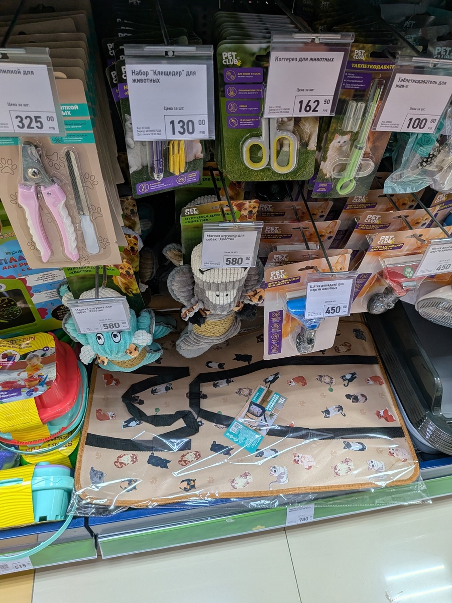 Раньше в магазинах сети уголок "для животных" состоял буквально из самых недорогих кормов да одноразовых пеленок, а теперь это почти полноценный отдел, где есть многое, что пригодится для питомцев. Я удивилась, когда заметила и коврики для мисок, и переноски, и ножницы для когтей, и специальные щетки для шерсти. Игрушки тоже выглядели круто, но эти цены почти в 600 рублей, конечно, останавливают от покупки, я бы на маркетплейсе лучше б приобрела.