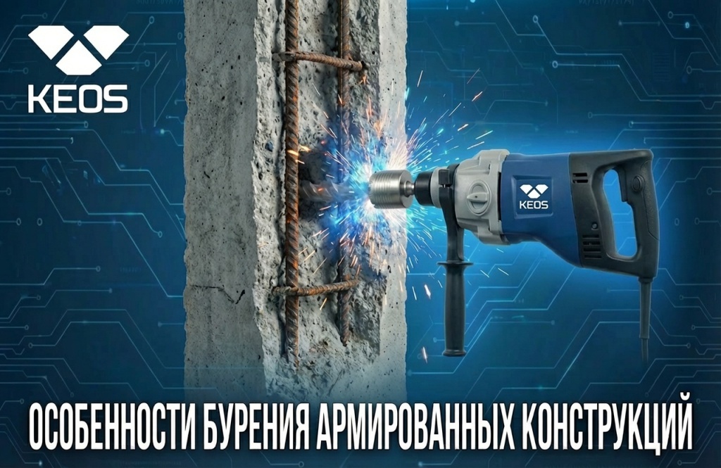 Железобетон — основной материал монолитного строительства. Наличие стального армирования создает для алмазного бурения специфические условия резания, отличные от неармированного бетона. Неправильный подход приводит к ускоренному износу коронок, заклиниванию инструмента и аварийным остановкам. Корректировка режимов и правильный выбор оснастки — ключевые факторы сохранения ресурса. В каталоге оборудования для алмазного бурения KEOS представлены установки, специально адаптированные для работы в железобетоне. Алмазные зерна эффективно разрушают хрупкие материалы (бетон, кирпич) за счет микроскалывания. Сталь, обладающая пластичностью и вязкостью, создает иные условия: Частота вращения. При входе в арматуру обороты снижаются. Оптимальная окружная скорость для стали — 1,2–1,8 м/с, что в 1,5–2 раза ниже, чем для бетона. Усилие подачи. При контакте с арматурой осевое усилие снижается на 30–50%. Избыточное давление приводит к разрушению алмазных зерен и заклиниванию. Охлаждение. Расход воды уве