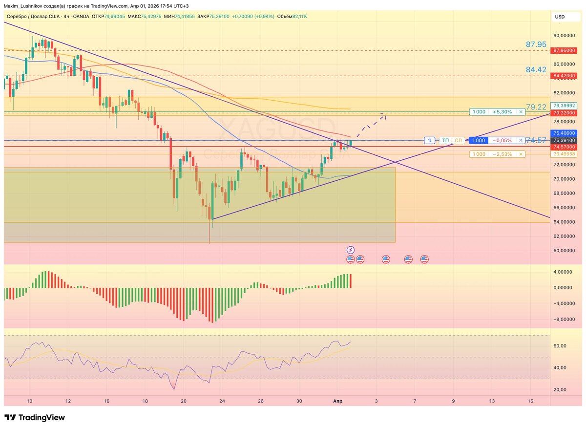 Вектор — Long 📈. Позиция набрана по рынку (~75.39) на фоне смены локального тренда и завершения долгосрочной коррекции. 🎯 Где искать покупки: Основной сценарий: Удержание текущей позиции. Для безопасного добора объема или новых входов — ожидаем импульсный пробой и закрепление выше отметки 76.00. Резерв (глубокий откат): В случае нехватки объемов для пробоя 76.00, допускается ретест зеркальной зоны 74.60. Формирование разворотного паттерна в этой зоне даст дополнительную точку входа. 💰 Цели: 79.22 (первичная) → 84.40 → 87.95 (согласно уровням старшего ТФ). 🛑 Отмена идеи: Уход цены и закрепление ниже локального минимума 73.68 – 73.70 (полный слом восходящей структуры и возврат в даунтренд). ⚠️ Риски: Ранний рыночный вход до пробоя ключевого сопротивления 76.00 снижает математическое ожидание сделки. Если цена встретит жесткий отпор продавца на 76.00, есть риск затяжной консолидации. Обязателен жесткий контроль стоп-лосса за уровнем 73.68. — @LushnikovTrade