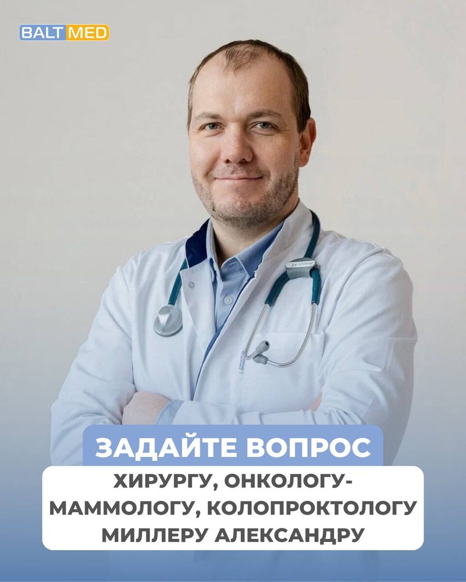 И да, в этот раз рубрика выходит 1 апреля — но вопросы и ответы будут максимально серьёзными 👇🏻🙂 В эту среду рубрику ведет: Миллер Александр Евгеньевич — врач-хирург, онколог-маммолог, колопроктолог с опытом более 22 лет. Александр Евгеньевич — специалист, к которому обращаются не только при «острых» состояниях, но и когда ситуация кажется сложной или непонятной: есть новообразование, длительные боли или уже поставлен диагноз, но остаются вопросы. Врач занимается диагностикой и лечением заболеваний желудочно-кишечного тракта, мягких тканей, молочной железы, а также заболеваний прямой кишки и анальной области. Выполняет современные операции и малоинвазивные процедуры с быстрым восстановлением. 👉🏻 Если у вас есть вопросы про: — новообразования кожи, мягких тканей и молочной железы — геморрой, анальные трещины, дискомфорт и боль — кровь при дефекации — опасно ли это — полипы и новообразования кишечника — колостому и уход за ней — боли и нарушения в работе ЖКТ — грыжи (паховые,