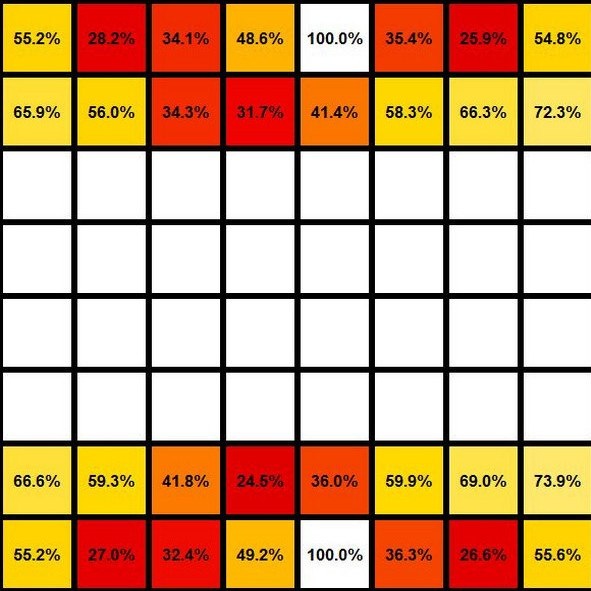 ? Анализ более двух миллионов шахматных партий, сыгранных на турнирах мастеров, выявил, что наибольшие шансы на выживание после королей имеют крайние пешки h2 и h7 — они остаются на поле более чем в 70% игр. За ними в рейтинге выживаемости следуют ещё 8 пешек линий a, b, f и g. И только за ними в этом списке находятся фигуры — четыре ладьи. Quora / What are the chances of survival of individual chess pieces in average games? https://www.quora.com/What-are-the-chances-of-survival-of-individual-chess-pieces-in-average-games