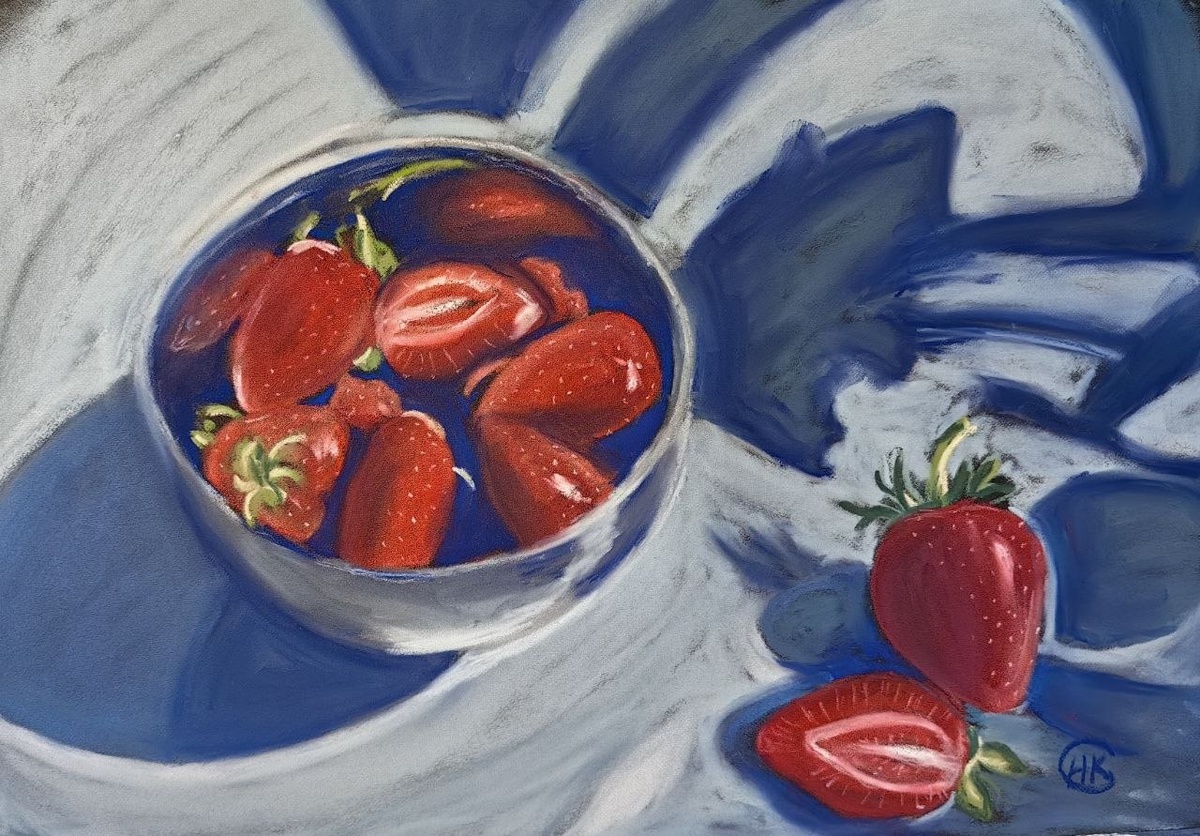 Нарисовала мягкой пастелью nuanse вот такую клубнику в металлической посуде с отражениями на стенках и тенями по фону