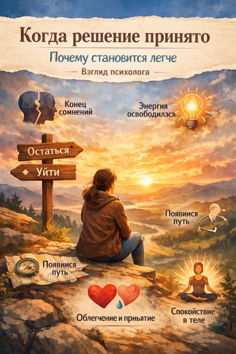 ? Есть особое чувство, которое трудно описать словами. Оно возникает не тогда, когда всё наладилось, не тогда, когда исчезли проблемы, и даже не тогда, когда мы уверены, что поступили правильно. Оно приходит в момент, когда решение — принято. И вместе с этим решением неожиданно становится легче на душе. Почему так происходит? 1. Завершается внутренний конфликт До принятия решения человек часто живёт в состоянии внутреннего раздвоения. Одна часть говорит: «Останься», другая — «Уходи». Одна убеждает: «Потерпи», другая — «Ты больше не можешь». Этот внутренний диалог истощает сильнее, чем сама проблема. Психика тратит огромное количество энергии на удержание противоположных вариантов. Когда решение принято, конфликт прекращается. Появляется целостность: «Я выбрал». Даже если выбор сложный — внутри становится намного легче. 2. Возвращается ощущение опоры на себя Сомнение — это всегда потеря опоры. Человек будто зависает между вариантами, не чувствуя, где его «земля». Решение воз