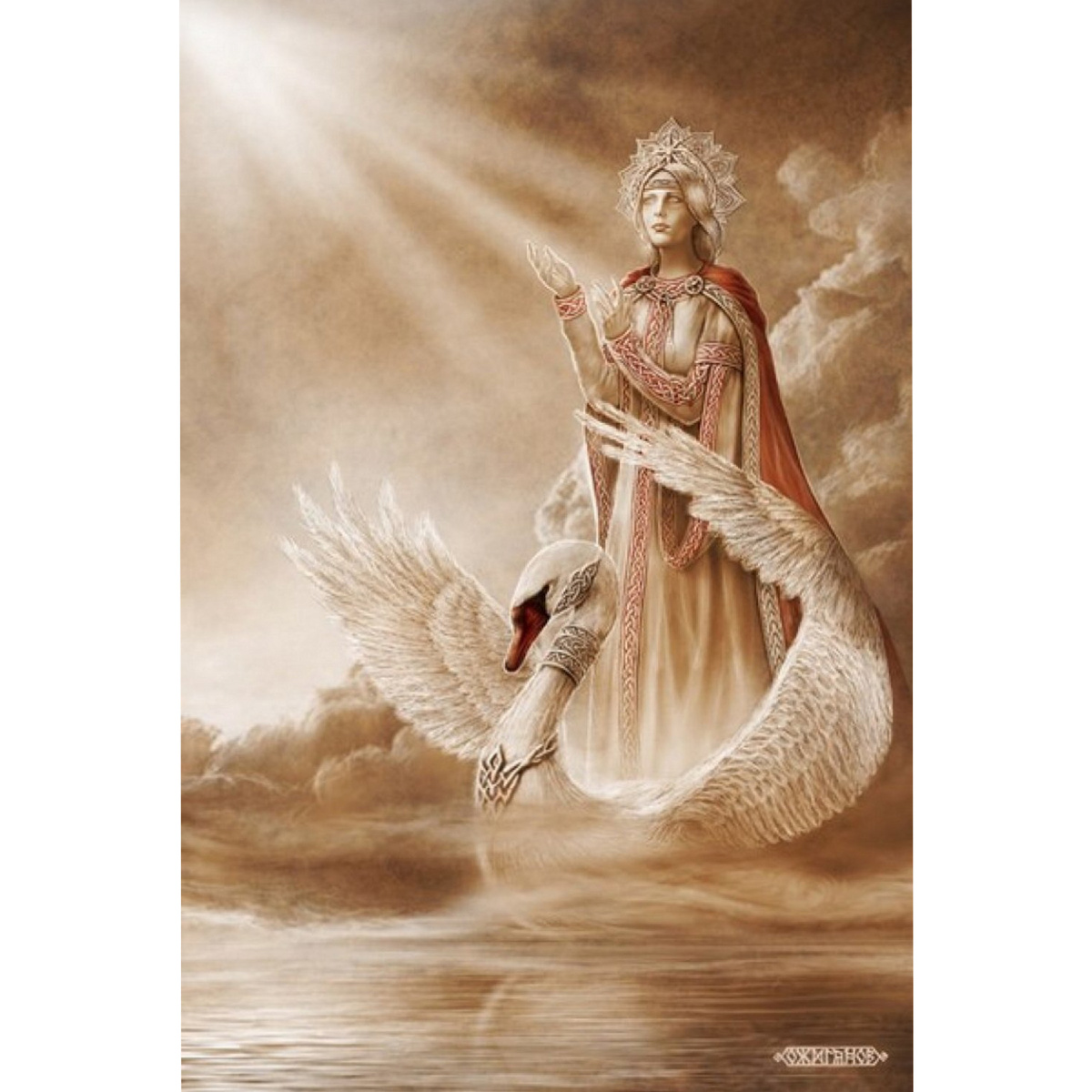 Из бликов солнца на воде, из изящных движений скользящих по поверхности лебедей, из шороха ветра и шепота березовых листьев соткался образ зрелой, величественной женщины. В длинных расшитых золотом одеждах и высоком кокошнике, чем-то напоминающем сложную диадему. Такой величественной мощью, но в то же время таким миром и ладом повеяло от женщины, что я низко и уважительно поклонился, представился и спросил: «Как твое имя, Царица?» «Я не царица, я Хранительница лада, мира и гармонии в семье и мире. По велению Рода низошла я в мироздание, принесся с собой принципы и правила совместного ладного существования в семье, в роду, в общине, в державе и во всем мироздании. Я Лада – Хранительница лада и мира во всех их проявлениях».
