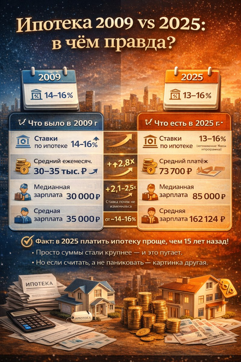 Сейчас куда ни плюнь — везде слышно: «ипотека душит», «ежемесячный платёж стал неподъёмным», «раньше как-то было легче». Я решил не спорить, а просто взять цифры и сравнить: как было, как стало. Поднял данные за 2009 год и сверил их с цифрами за 2025-й. Получилась интересная картинка. Даже неожиданная. 📅 Что было в 2009 году 🏦 Ставки по ипотеке — в среднем 14–16% годовых. 💰 Средний ежемесячный платёж по ипотеке в Москве — 30–35 тыс. ₽. 👛 Медианная зарплата — около 30 000 ₽. 👷♂️ Средняя зарплата — около 35 000 ₽. Платёж съедал почти всю зарплату. Жили по принципу «получил — отнёс банку — выжил». 📅 Что есть в 2025 году 🏦 Ставки — 13–16% годовых (в зависимости от банка и программы). 💰 Средний платёж по ипотеке в Москве — 73 700 ₽. 👛 Медианная зарплата — 85 000 ₽. 👷♂️ Средняя зарплата — 162 124 ₽. Доходы выросли сильнее, чем платежи. Даже у «середнячков» ипотека перестала быть смертельным приговором. 📈 Что изменилось: Медианная зарплата выросла в 2,8 раза. Платёж по ипотеке —