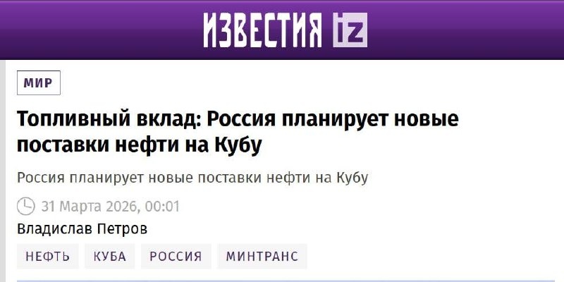 🛢 Друзья, мой комментарий вышел в «Известиях» по теме поставок российского топлива на Кубу. 📌 Статья называется «Топливный вклад: Россия планирует новые поставки нефти на Кубу». В ней разбирают планы по возобновлению и расширению энергетического сотрудничества между двумя странами. 💬 В комментарии я отметил: Основная часть сырья будет переработана на единственном крупном НПЗ страны в Сьенфуэгосе для выработки мазута и дизельного топлива. Это позволит хотя бы немного стабилизировать энергоснабжение и снизить веерные отключения электричества, но временно 🔗 Полный материал читайте на русском и английском языках: Русская версия: https://iz.ru/export/google/amp/2069231 Английская версия: https://iz.ru/en/node/2069231 ❓ А вы как считаете — стоит ли России активно помогать Кубе топливом в нынешних условиях? Жду ваших мнений в комментариях! 🇷🇺🇨🇺