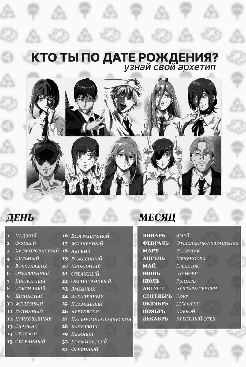 ! Мы решили не нервировать вас очередными «шутками», а придумали интересный интерактив. Совмести своё число + месяц рождения и узнай свой никнейм в мире NIKIFILINI 😁 ну и отпишись в комменты! P.S. Админ — Адский Отшельник-Извращенец... ну штош