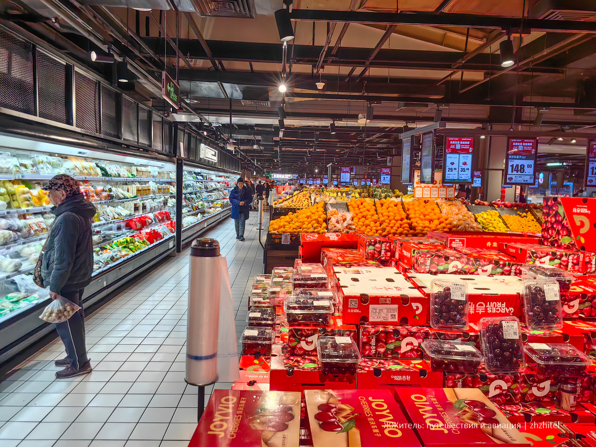 Вернулся из Китая. Специально для вас я прогулялся по магазину популярной сети и сделал фотографии, чтобы сравнить цены в Пекине и у нас. Предупреждаю: некоторые фотографии вас могут удивить, а некоторые шокировать. Замечу, что многие китайцы по-прежнему покупают продукты на рынках или в небольших магазинчиках, но большие супермаркеты здесь тоже есть и пользуются популярностью. Я зашел в Wumart — это «народный» супермаркет. Или гипермаркет, они бывают разными по размеру. Для начала немного о валюте и ценниках. Курс юаня на момент публикации статьи 11,71 руб., в начале февраля, когда мы ездили в Китай, он был ниже. Для удобства я буду считать по курсу 11,5 руб. за юань. Еще важный момент, чтобы всё не было слишком просто: на ценниках весовых товаров тут принято указывать цену за 0,5 кг (это 1 цзинь). Это нужно иметь в виду. Чтобы вам было комфортнее читать, я перевел цены в рубли за килограмм. Обычно, когда мы приезжаем в какой-нибудь город, покупаем что-нибудь к чаю. В Китае с выпечко