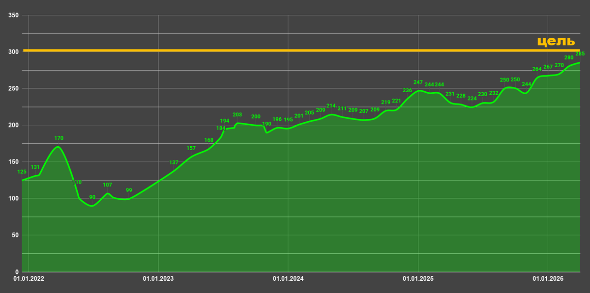 По состоянию на 01.04.2026 накоплена сумма, эквивалентная 285 МЖ (95% от цели, её я называю "fire" - fin independence, retire early или финансовая независимость, ранняя пенсия). Как посчитано? Беру стоимость всех активов на всех счетах. И делю на среднемесячные расходы за последний год. Повторяю расчет из месяца в месяц. Динамика по годам: ▪️ 2021: 104 → 127 МЖ, или 35% → 42% fire. ▪️ 2022: 127 → 125 МЖ, или 42% → 41% fire. ▪️ 2023: 125 → 195 МЖ, или 41% → 65% fire. ▪️ 2024: 195 → 247 МЖ, или 65% → 82% fire. ▪️ 2025: 247 → 267 МЖ, или 82% → 89% fire. ▪️ 2026: 267 → ??? Осталось 15 МЖ до достижения цели. За март прибавилось +5 месяцев — и снова не благодаря рыночной доходности, а вопреки. Ещё и сумма в знаменателе (расходы) постепенно прибавляется. Короче, сложно, очень сложно. Но я движусь к своей цели, и у меня нет сомнений в том, что она достижима. @finindie