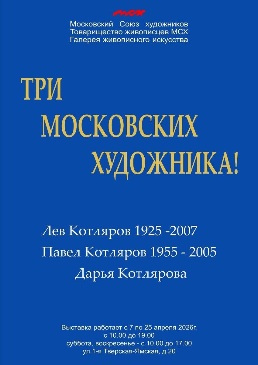 С 7 по 25 апреля в выставочном зале Товарищества живописцев МСХ пройдёт выставка «Три московских художника!». На выставке представлены произведения представителей трех поколений художественной династии Котляровых: Льва Серафимовича, Павла Львовича и Дарьи Павловны.