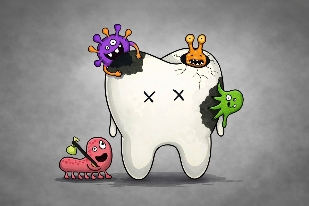 Кариес — одно из самых распространённых заболеваний полости рта, но при этом одно из самых недооценённых. Многие пациенты обращаются к врачу уже на стадии боли, хотя процесс разрушения зуба начинается значительно раньше и часто протекает бессимптомно. Важно понимать: кариес — это не просто «дырка в зубе». Это сложный биохимический процесс, который запускается на уровне микрофлоры и постепенно разрушает твёрдые ткани зуба — эмаль и дентин. Кариес зубов — это патологический процесс, при котором происходит разрушение твёрдых тканей зуба под воздействием кислот, образующихся в результате жизнедеятельности бактерий. Развитие кариозной полости зачастую происходит незаметно, симптоматика остаётся невыраженной до момента появления глубокого кариеса или его осложнений, таких как пульпит зуба. Развитие кариозных полостей — это всегда результат сочетания нескольких факторов. Полость рта является благоприятной средой для микроорганизмов, включая Streptococcus mutans. Механизм развития кариеса: Мя