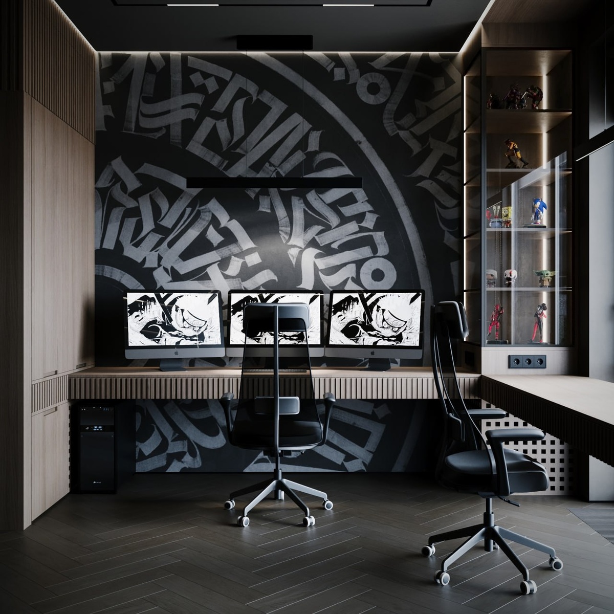 Вводные: Кабинет с функцией работы, отдыха и хобби. Нужно было уместить полноценное рабочее место, зону релакса и хранение коллекций, при этом сохранить чистую геометрию и не перегрузить пространство. Риски: Много функций в одном помещении → риск визуального хаоса Акцентная стена могла «перетянуть» всё внимание и перегрузить интерьер Открытые полки и декор → риск захламления Рабочее место на несколько экранов требует грамотной эргономики Что сделали? - Собрали рабочую зону вдоль окна - максимальный свет и логичная посадка - Интегрировали стол в единую мебельную конструкцию с хранением - Добавили витрины с подсветкой - Сделали акцентную стену с графикой - Организовали мягкую зону с диваном - Встроили хранение в глухие фасады, чтобы убрать лишний визуальный шум Как решили проблемы? - Разделили функции, но оставили их в одной архитектурной системе - Акцентную стену уравновесили спокойными фасадами и деревом - Подсветкой в витринах структурировали декор - Рабочее место выстроили по ос