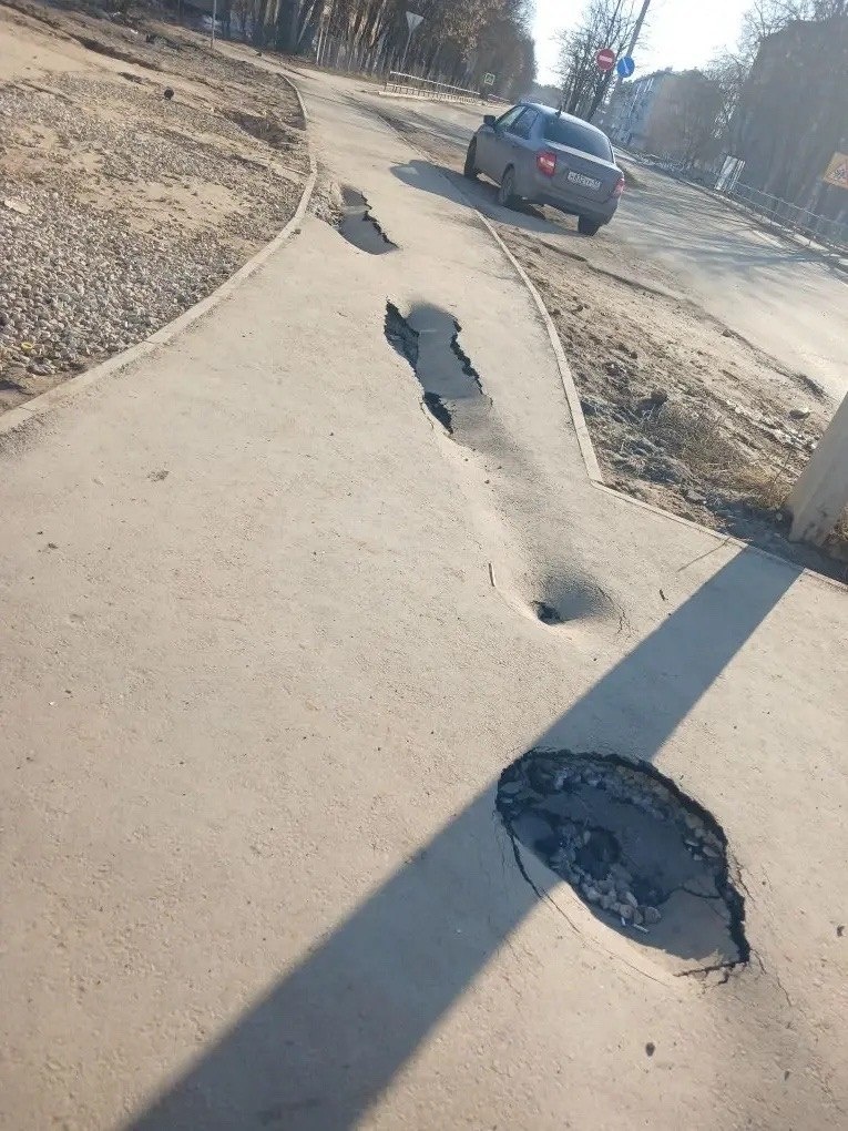 Новый тротуар микрорайон Текмаш... где положили трубы там произошли такие обвалы и на дороге к девятиэтажкам и тротуар...