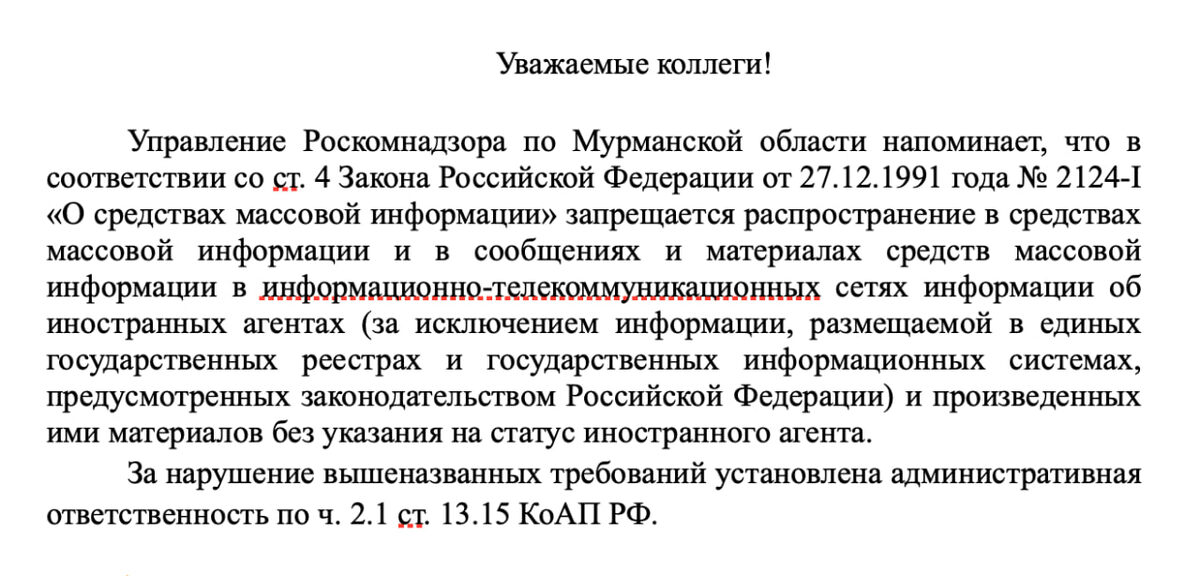 Мурманские медианадзиратели в очередной раз запугивают местные СМИ штрафами за неуказание плашки при упоминании иногагентов (все знают, как