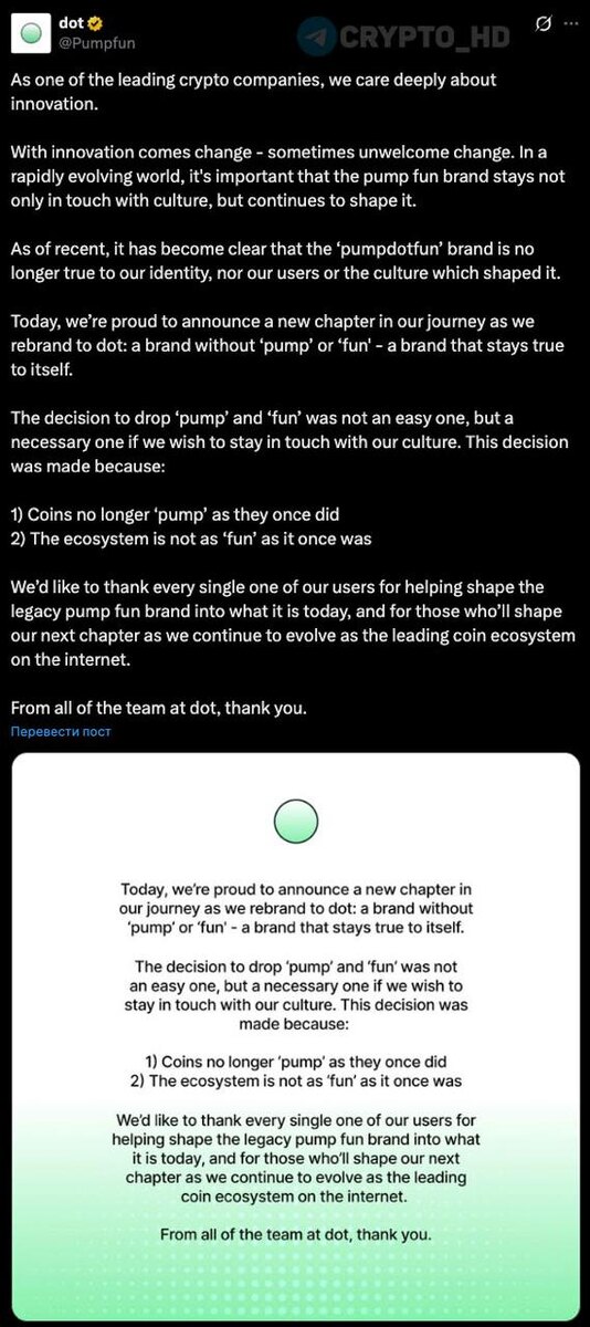 ! Проект проводит ребрендинг, меняя название на «dot». Причина: команда считает, что старое название уже не отражает текущую ситуацию на рынке – токены больше не растут так стремительно, а весь опыт пользователей стал менее позитивным. Символичный отход от слов «pump» и «fun» – признание новых реалий крипторынка. Crypto Headlines
