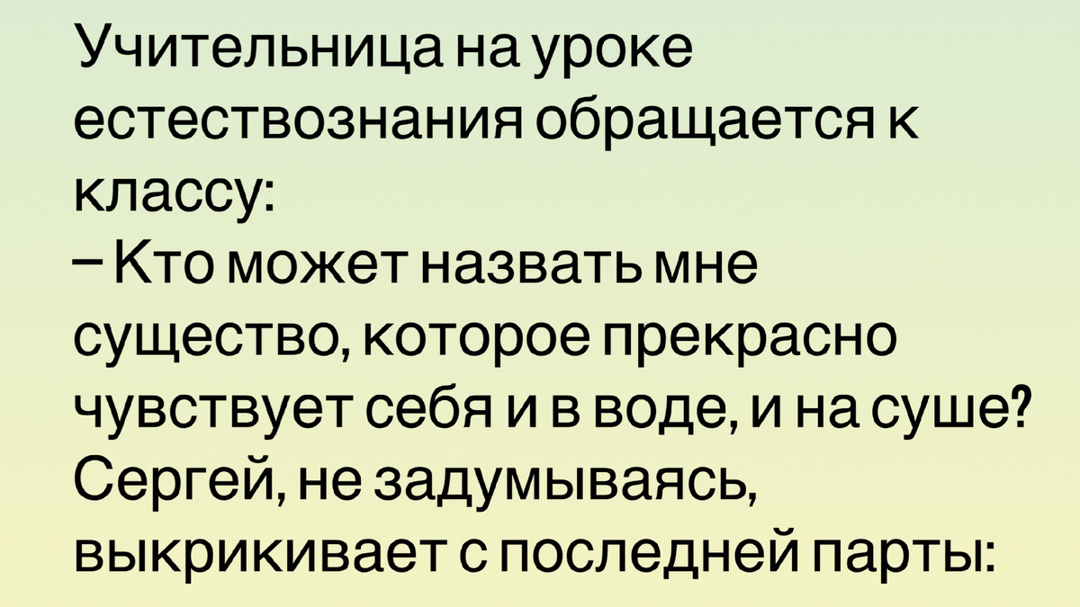 Физруки в школьном фольклоре — это отдельная каста людей, обладающих сверхспособностями. Они действительно кажутся существами вне времени и пространства. Обратите внимание, как точно Сергей подметил адаптивность этого персонажа. Для ребенка мир делится не на биологические виды, а на типы поведения взрослых. Если человек одинаково органично смотрится в разных стихиях, значит, он — амфибия, и спорить с этим бесполезно. Да и вообще детская логика — самая честная вещь в мире. В то время как учебник ждет ответа про лягушку или крокодила, жизнь подсовывает нам гораздо более яркие примеры. Это напоминает нам о том, что школа — это не только сухие факты из параграфов, но и живое общение с колоритными личностями, которые остаются в нашей памяти на десятилетия, иногда даже затмевая собой знания по биологии.