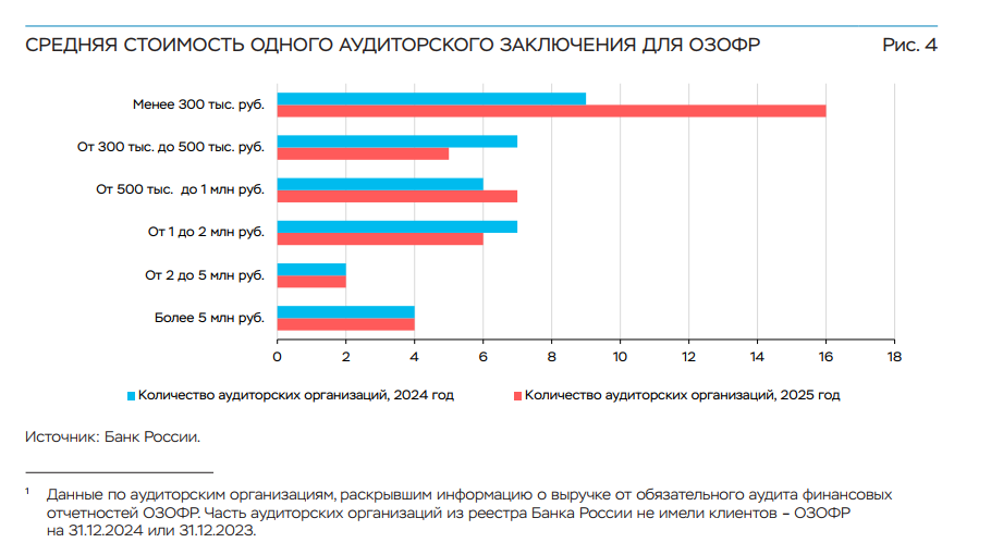 Отдельный блок обзора посвящен стоимости аудита. Банк России прямо указывает на существенную неоднородность ценообразования на рынке аудиторских услуг и показывает распределение аудиторских организаций по средней стоимости одного аудиторского заключения для ОЗОФР. В этом распределении сохраняется нижняя категория «менее 300 тыс. руб.».