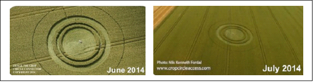 4. Игнорирование фактов. Некоторые люди просто отвергают прозаическое объяснение и считают, что инопланетяне пытаются донести до нас, простых землян, свою мысль («круги-фразы») или своё присутствие («круги-следы») любым удобным для себя способом: разнообразием «кругов» в разных местах или повторением одних и тех же в одном. Как, например, появление в местечке Уэст-Кеннетт-Лонгбарроу графства Уилтшир (Великобритания) двух абсолютно идентичных мегарисунков практически на одном поле, но первый - 26 июня 2014 года, а второй - 13 июля того же года (см. рисунок). Как будто кто-то хотел что-то подтвердить!.. Или похулиганить...