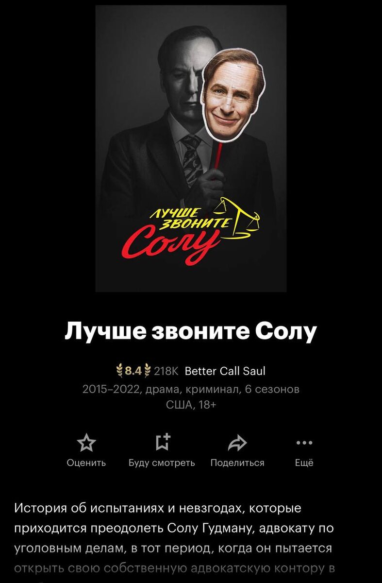 Досмотрела на стримах Лучше звоните Солу. Наверное, проблема в том, что начала смотреть сразу после Во все тяжкие, и сравнение происходит неизбежно. Так вот, Сол ощущается как эссе на тему двух созависимых людей, которые не совсем сами себя понимают и разобраться в этом не спешат. Этакие недохулиганы, которые потихоньку губят и себя, и все вокруг. При этом они не вызывают столь ярких эмоций, как это было в Тяжких. Благо, в сериале есть Гус и Майк (Лало 👎) 7.5/10 (с авансом)