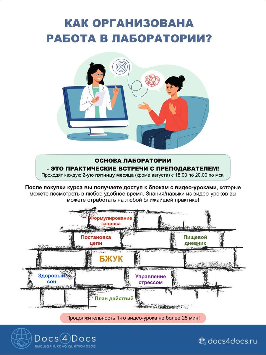— это пространства для исследование своей практики, многочисленных экспериментов и тестирования «сырых» идеи, а еще для поиска нового: практик, методик, знаний, инсайтов. Здесь разрешены ошибки и неудачи, как важная часть исследования. Чтобы быть эффективным диетологом, нужны знать, как организовать изменение поведения, и иметь навыки консультирования. Чтобы натренировать навык, нужно время и много практики. Лаборатория - это годовой проект, который состоит из теории + ежемесячных практик с преподавателем. Не важно, когда вы вступили, закончится лаборатория 31 декабря! ▪️Видео-уроки мы постепенно добавляем в течение полугода. Вы можете их смотреть в любое удобное время. Продолжительность 1 видео-урока до 25 мин. ▪️Практики с преподавателем проходят каждую 2-ю пятницу месяца (кроме августа) с 18.00 до 20.00 по Мск. Даты практик: 10 апреля; 8 мая; 12 июня; 10 июля; 11 сентября; 9 октября; 13 ноября; 11 декабря. Практики не записываются! ▪️ А еще есть чат, где вы можете обсудить л