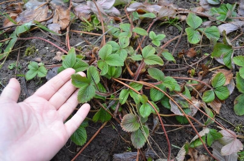 Клубника уходит под зиму с зелёными листьями, на которых часто зимуют болезни и вредители. Я убираю сухие листья руками, без граблей. Грабли легко могут повредить сердечко куста или оголённые корни — весной их часто размывает талой водой.