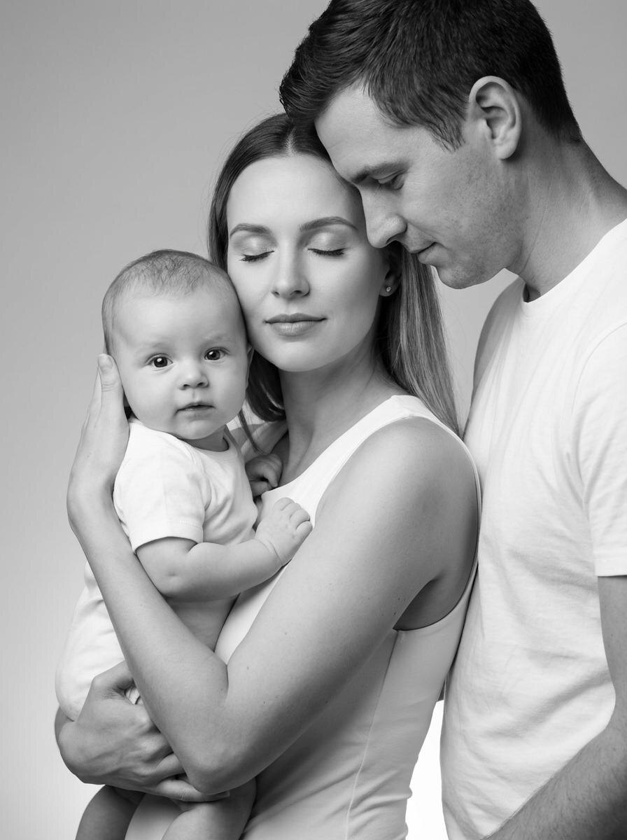 Черно-белая семейная фотосессия мамы, папы и ребёнка в плотном студийном портрете промт для нейросети ИИ