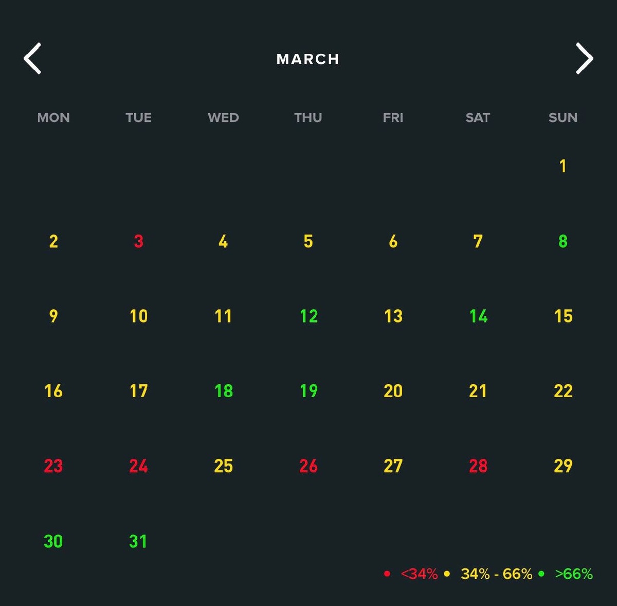 Короче, я гоняю с этим устройством уже больше трех месяцев и пытаюсь понять, для чего же он нужен и чем он лучше Apple Watch? Сегодня я наконец это понял и извлек свою ценность из этого девайса. Всё просто, нужно тупо ложиться спать в одно и то же время. Всё. Больше никаких секретов нет. На первых двух скриншотах показан уровень моего Recovery за последний месяц и неделю. Чаще всего это — 40-60% (желтый уровень), что терпимо, но не очень хорошо. И в какие-то дни уровень вообще красный (это примерно ниже 30%). Такой показатель бывает обычно тогда, когда ты заболел, или вчера была бурная ночь, или просто недоспал. WHOOP приучил меня стремиться к зеленому уровню и я наконец понял, в чем весь прикол. На 3, 4 и 5 скриншотах показан уровень восстановления за последние три дня, а на 6, 7 и 8 скриншотах показано то, во сколько я ложился спать и сколько я спал. И всё чудо в том, что чувствую последние три дня я себя прекрасно, хотя сплю чуть больше, чем 6 часов. По итогу я пришел к пониман