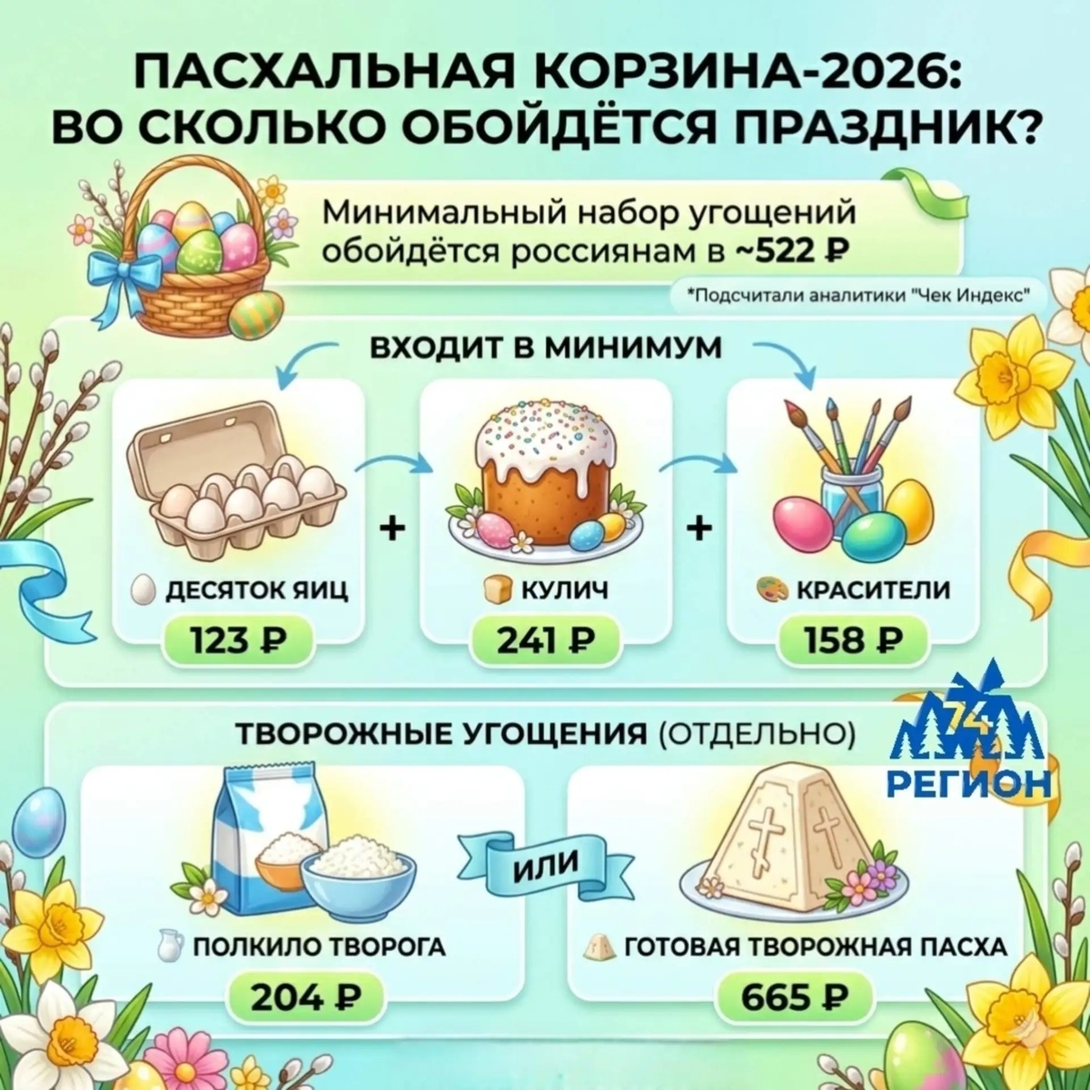 🪺Минимальный набор пасхальных угощений в этом году обойдётся россиянам в 522 рубля, подсчитали аналитики «Чек Индекс». В корзину вошли: кулич (241 руб.), десяток яиц (123 руб.) и красители к ним (158 руб.). Отдельно — полкило творога за 204 рубля или готовая творожная пасха за 665 рублей.