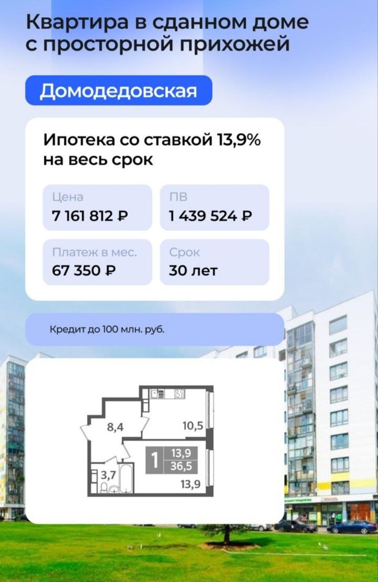 ⚫️Условия программы со ставкой 3,5% ПВ: 20,1%; ставка: 3,5% Сумма кредита: до 12 млн.; срок до 30 лет Пример расчета — 1ккв. 43.1 м² с видом на 2 стороны света ⚫️Условия программы со ставкой 13,9% ПВ: 20,1%; ставка: 13,9% Сумма кредита: до 100 млн.; срок до 30 лет Пример расчета — 1ккв. 36.5 м² с подчистовой отделкой Преимущества проекта: • В 25 минутах транспортом выезд на МКАД и метро «Домодедовская • Свободные планировки, потолки высотой 3 м и панорамное остекление • Придомовая территория благоустроена летним кинотеатром, детскими игровыми площадками, скейтпарком.