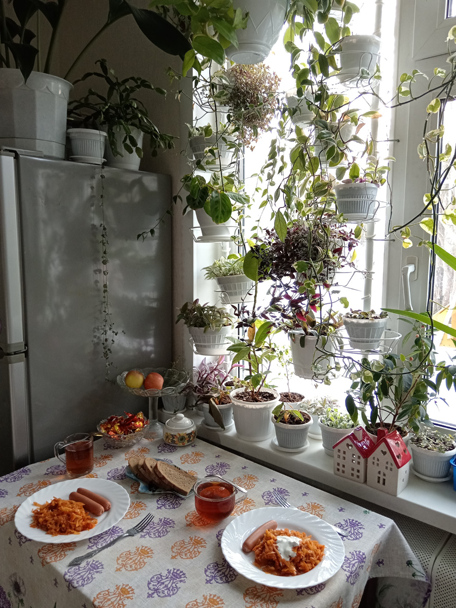 На завтрак разогрела тушёную капусту. Отварила сосиски.