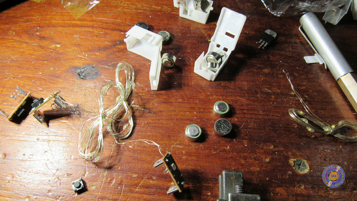 Особого там ничего такого нет. Контроллер, кнопка, контакты для "таблеток" AG13, ну, и сами проводки с микросветиками.