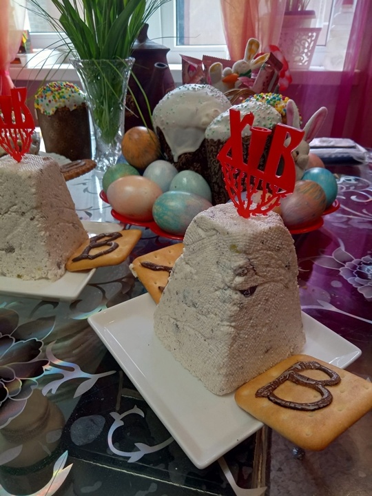В преддверии Пасхи напомним очень красивый рецепт традиционного пасхального блюда: ✔ Получилась замечательная - вкусная, нежная, форму держит прекрасно! ✓ 500 г творога 5%, ✓ Три пакетика фитпарада, ✓ 1 пакетик ванили, ✓ 100 г сметаны, ✓ 100 г сливочного масла, ✓ 80 г вяленой клюквы, ✓ 40 г горького шоколада, ✓ Можно добавить дроблёные орехи. Творог, сахарозаменитель, ваниль взбить блендером. Добавить растопленное сливочное масло, сметану, измельчённый в крошку шоколад, орехи, клюкву, и хорошенько всё размешать. Форму для творожной пасхи застелить марлей, наполнить творожной массой, хорошенько утрамбовать ложкой. Прикрыть концами марли, перевернуть узким концом с дырочками и поставить в тарелку. Накрыть чем-то плоским, и придавить грузом часов на 5-6. Сыворотку постоянно сливать. Затем поставить на ночь в холодильник, а утром снять форму и марлю, и выставить на блюдо. Можно полить горьким шоколадом, посыпать кокосовой стружкой или тёртым шоколадом. КБЖУ на 100 г – 285/12,4/20,6/12,0 (и